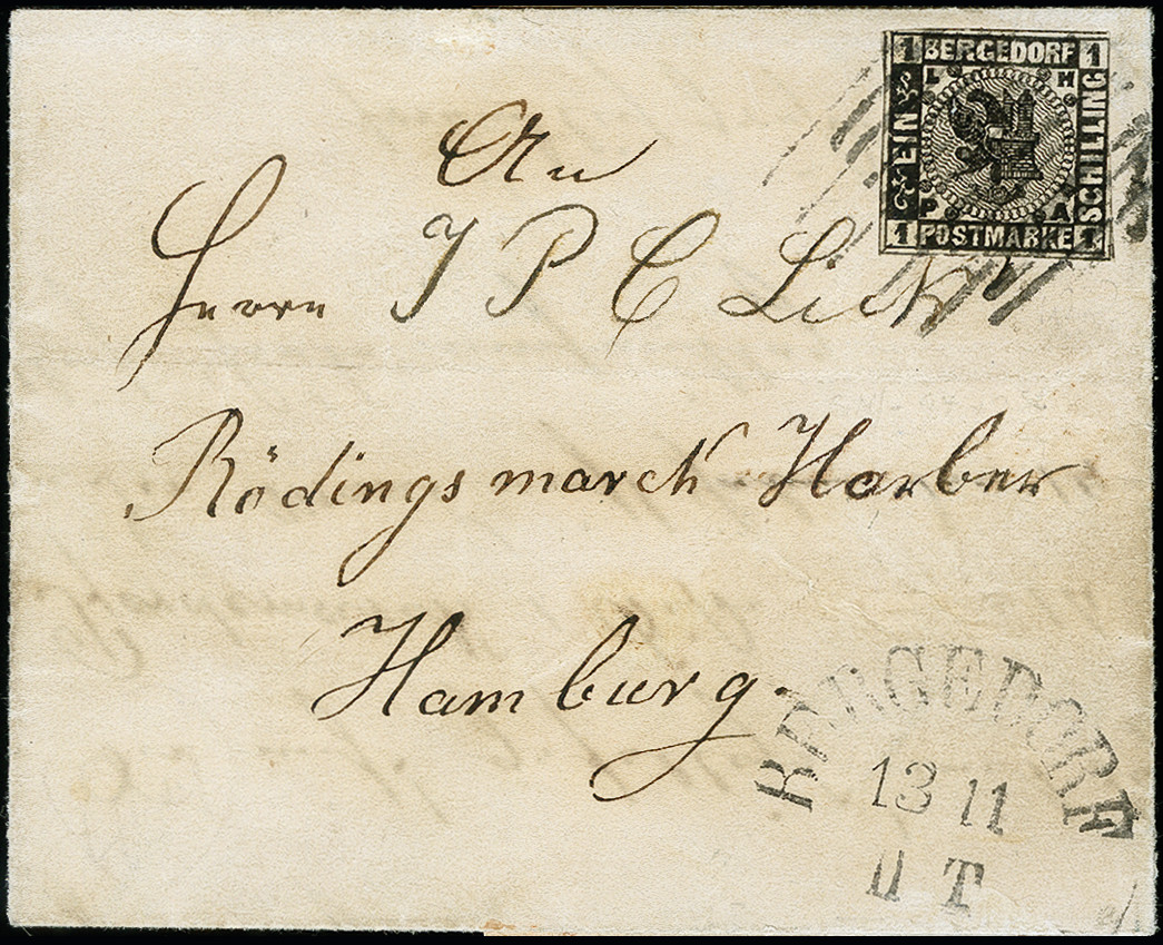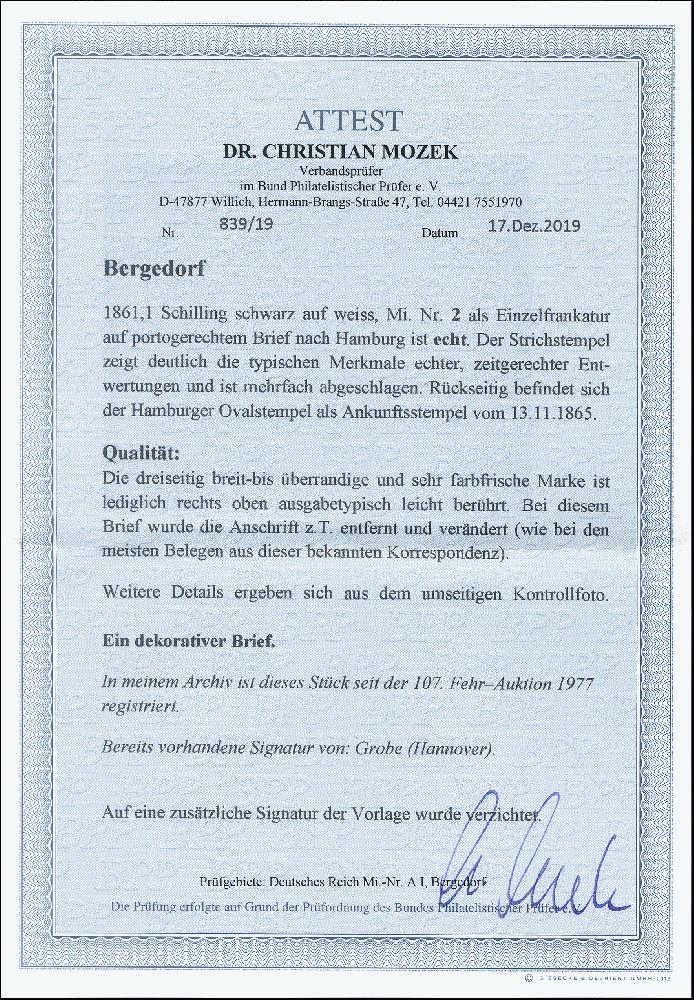 | Zusatzinformationen und Suchstichworte: | 373. Auktion Heinrich Köhler 23.-27. Juni 2020 Los 2949 1 Sch. schwarz, rechts oben leicht berührt, sonst breit- bis überrandig und sehr schön farbfrisch, mit mehrfach aufgesetztem Strichstempel auf kpl. kleinem Faltbrief mit nebengesetztem Aufgabestempel "BERGEDORF 13 11" (1865) nach Hamburg mit rückseitigem Ankunftsstempel vom selben Tag; wie bei den meisten Belegen aus dieser bekannten Korrespondenz ist der Name in der Anschrift abgeändert, sonst einwandfrei; sign. Grobe und Fotoattest Dr. Mozek BPP (2019) Zuschlag 900,00 EUR |