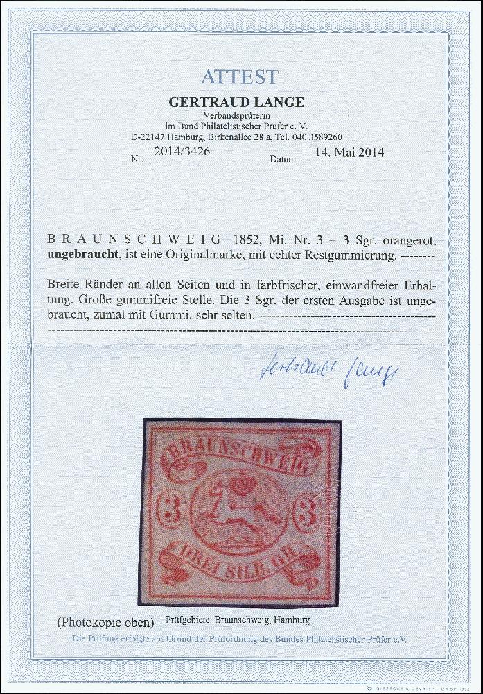 | Zusatzinformationen und Suchstichworte: | 373. Auktion Heinrich Köhler 23.-27. Juni 2020 Los 2952 1852, 3 Sgr. orangerot, farbfrisch und allseits breitrandig, ungebraucht mit großer gummifreier Stelle, sonst einwandfrei, sehr selten, bisher sind nur wenige ungebrauchte Marken bekannt, Fotoattest Lange BPP (2014) Zuschlag 2.800,00 EUR |