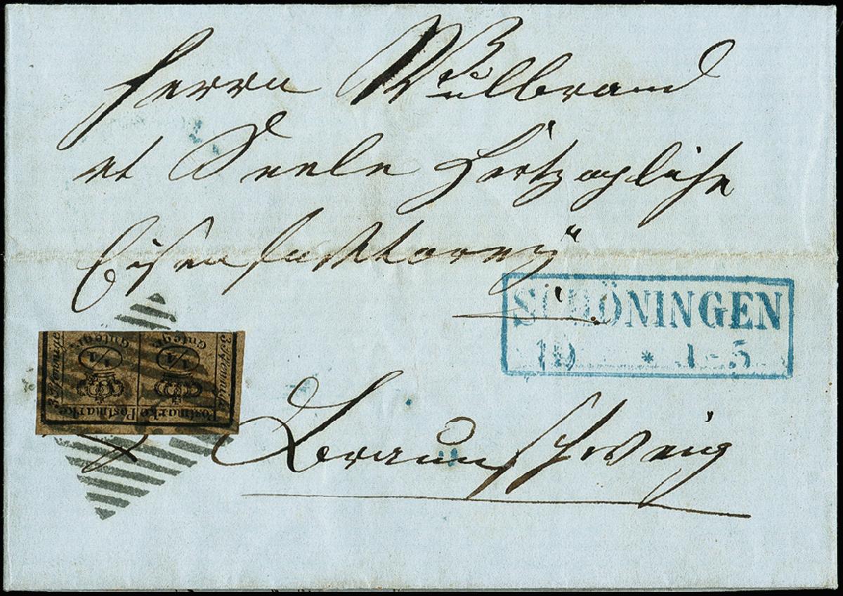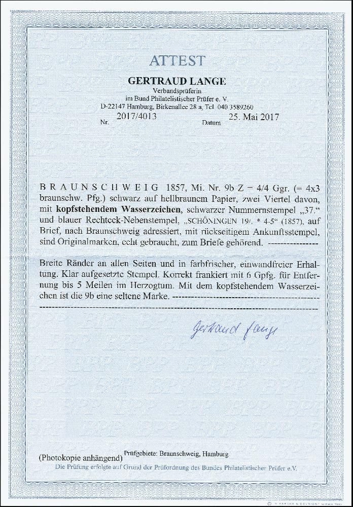 | Zusatzinformationen und Suchstichworte: | 373. Auktion Heinrich Köhler 23.-27. Juni 2020 Los 2954 1857, 2/4 Ggr. auf gelbbraunem Papier mit kopfstehendem Wz., farbfrisch und allseits breitrandig mit klar aufgesetzter Nr. "37" und nebengesetztem blauen Ra2 "SCHÖNINGEN 19 .." (1857) auf kleinem kpl. Faltbrief nach Braunschweig. Ein hübscher kleiner Brief mit der seltenen Wasserzeichenabart. Fotoattest Lange BPP (2017) Zuschlag 400,00 EUR |
