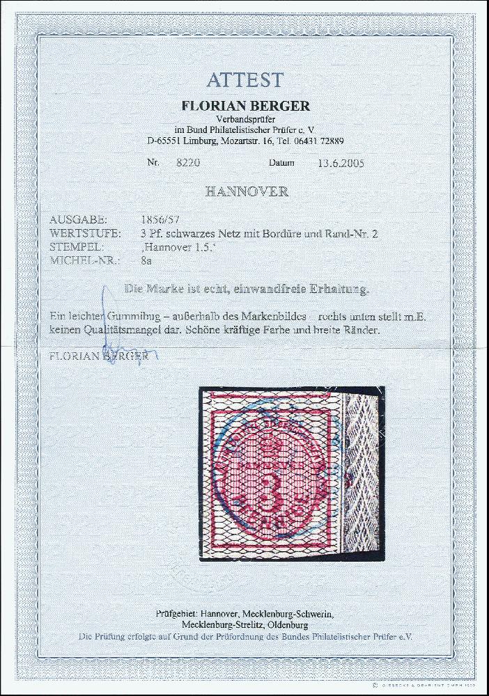 | Zusatzinformationen und Suchstichworte: | 373. Auktion Heinrich Köhler 23.-27. Juni 2020 Los 2969 1856/57, 3 Pfg. schwarz genetzt, allseits breit- bis überrandig, oben mit Teil der Nachbarmarke und rechts mit Bordürenrand mit Reihenzähler "2", leicht entwertet durch DKr. von Hannover, Kabinett, Fotoattest Berger BPP (2005) Zuschlag 240,00 EUR |
