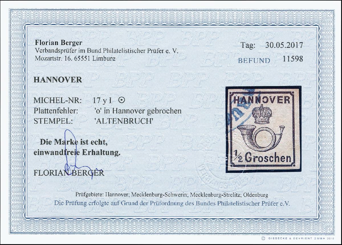 | Zusatzinformationen und Suchstichworte: | 373. Auktion Heinrich Köhler 23.-27. Juni 2020 Los 2970 1860/62, Drucksachenmarke ½ Gr. schwarz, weiße Gummierung, mit Plattenfehler "O in HANNOVER gebrochen", sauber gestempelt, Pracht, Fotobefund Berger BPP (Mi. 500,-) Zuschlag 160,00 EUR |