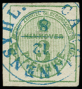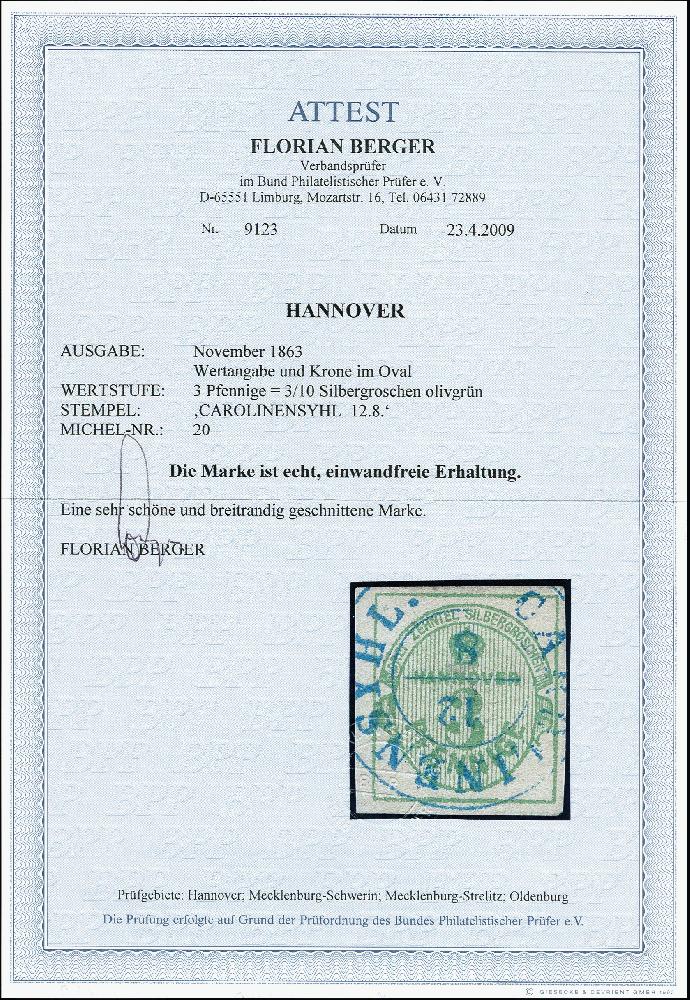 | Zusatzinformationen und Suchstichworte: | 373. Auktion Heinrich Köhler 23.-27. Juni 2020 Los 2971 1863, 3 Pfg. grün, allseits besonders breitrandig und sehr schön farbfrisch, sauber entwertet durch zentrischen DKr. "CAROLINENSYHL 12/8", ein besonders schönes Stück in tadelloser Erhaltung, Fotoattest Berger BPP (2009) Zuschlag 460,00 EUR |