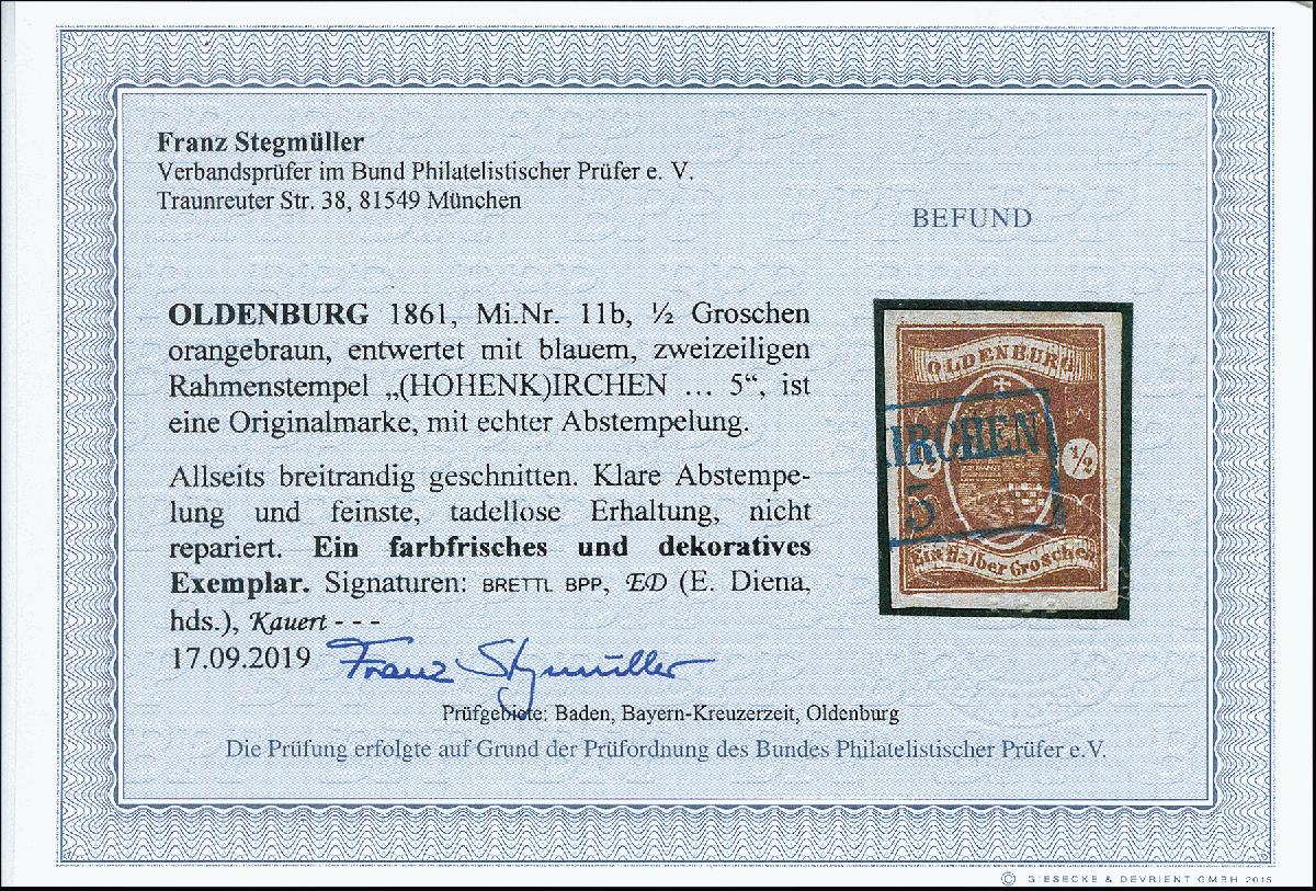 | Zusatzinformationen und Suchstichworte: | 373. Auktion Heinrich Köhler 23.-27. Juni 2020 Los 2981 ½ Groschen orangebraun, sehr schön farbfrisch und allseits breit geschnitten mit sauber aufgesetztem blauen Ra2 von "(HOHENK)IRCHEN", Kabinett, u.a. Brettl BPP und Kauert sowie Befund Stegmüller BPP (2019) (Mi. 650,-) Zuschlag 240,00 EUR |