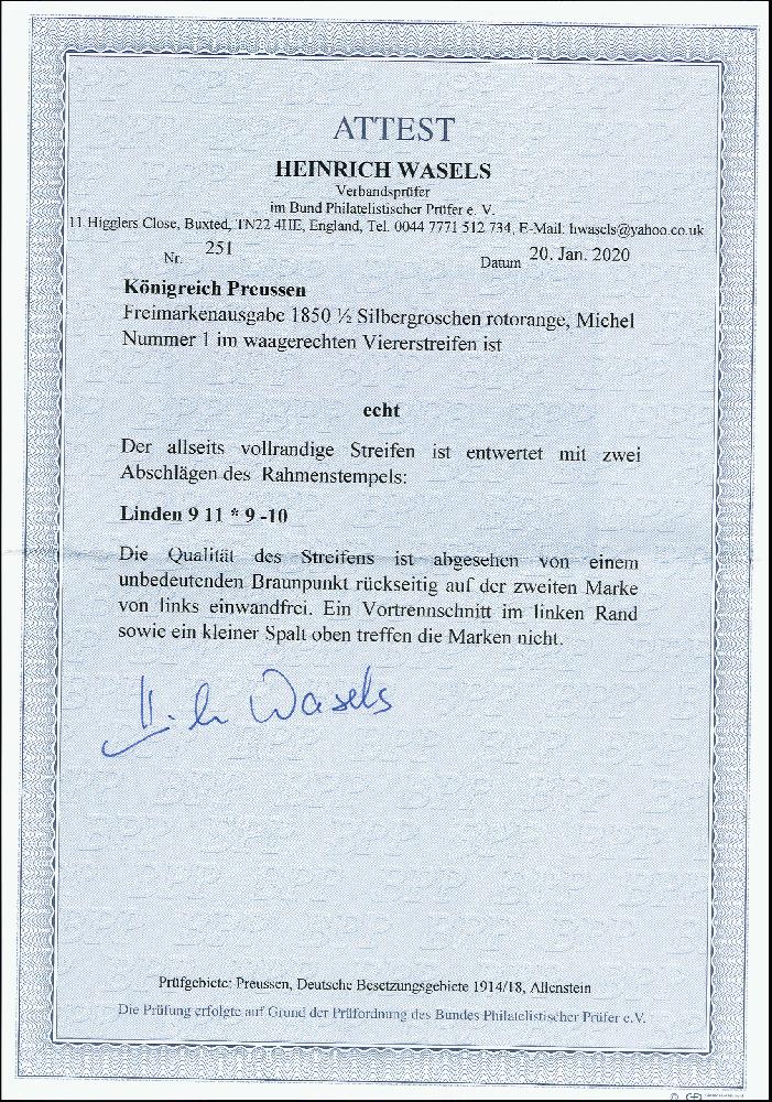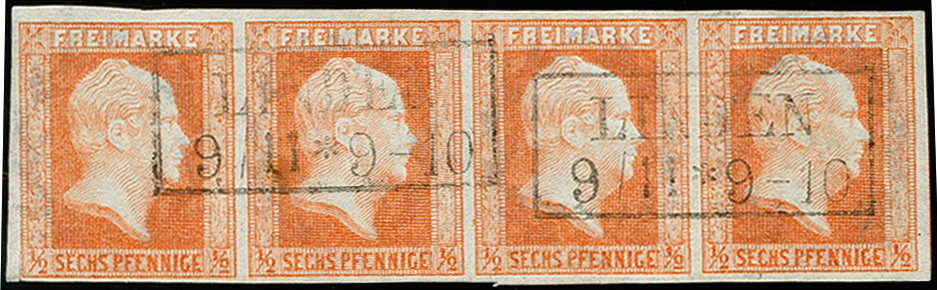 | Zusatzinformationen und Suchstichworte: | 373. Auktion Heinrich Köhler 23.-27. Juni 2020 Los 2987 1 Sgr. rotorange im waagerechten 4er-Streifen, farbfrisch und voll- bis breitrandig, sauber entwertet durch paarweise sauber aufgesetzten Ra2 "LINDEN 9/11"; ein Wert unauffälliger kleiner Fleck, sonst einwandfrei, Fotoattest Wasels BPP (2020) Zuschlag 380,00 EUR |