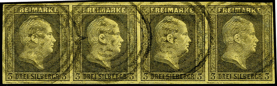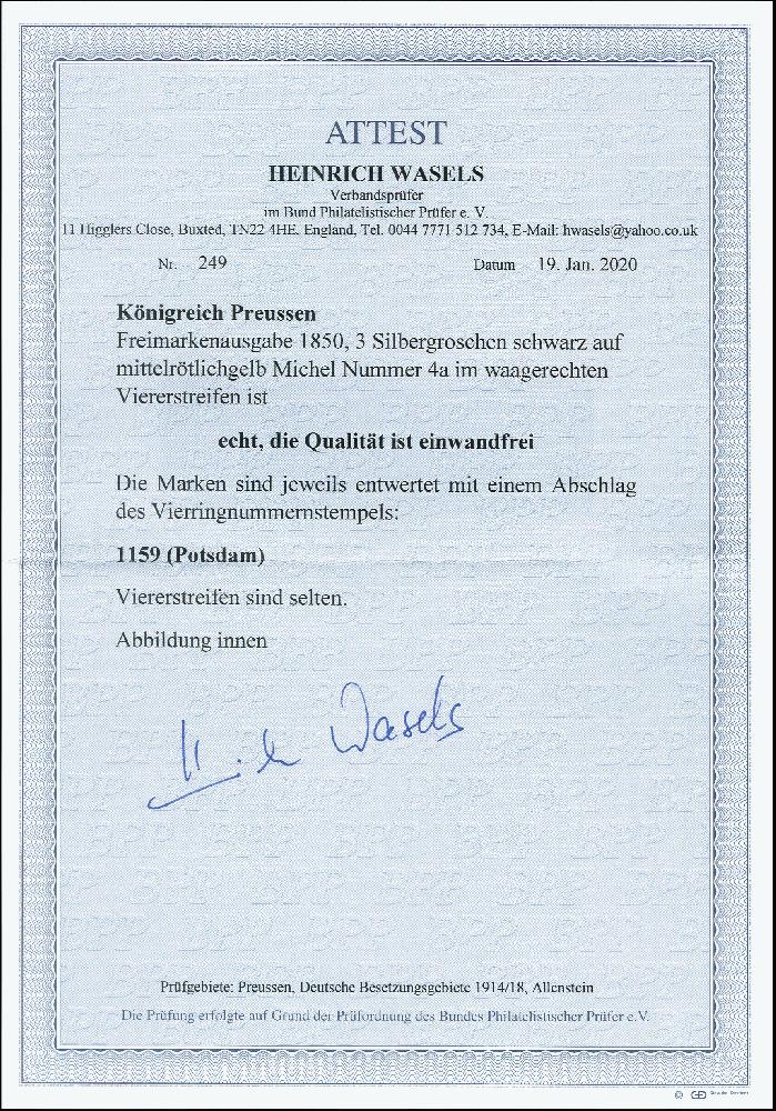 | Zusatzinformationen und Suchstichworte: | 373. Auktion Heinrich Köhler 23.-27. Juni 2020 Los 2993 3 Sgr. auf gelb im waagerechten 4er-Streifen, voll- bis breitrandig und in schöner frischer Farbe, entwertet durch Nr. "1159" POTSDAM, tadellos, Fotoattest Wasels BPP (2020) Zuschlag 240,00 EUR |