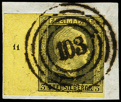 | Zusatzinformationen und Suchstichworte: | 373. Auktion Heinrich Köhler 23.-27. Juni 2020 Los 2994 3 Sgr. auf gelb in schöner frischer Farbe, voll- bis breitrandiges linkes Randstück mit ca. 10 mm Bogenrand mit Reihenzähler "11", mit zentrischer Nr. "103" BERLIN auf Briefstück, Kabinett, Kurzbefund Wasels BPP Zuschlag 70,00 EUR |