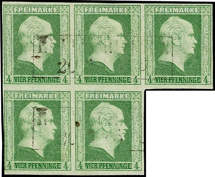 | Zusatzinformationen und Suchstichworte: | 373. Auktion Heinrich Köhler 23.-27. Juni 2020 Los 2998 4 Pfg. grün im waagerechten 5er-Block, farbfrisch und voll- bis breitrandig, leicht entwertet durch Ra2 "RELLINGHAUSEN 20 2"; in der rechten Marke unauffällige senkrechte Bugspur und bei der linken oberen Marke der Stempel ganz gering durchschlagend; eine attraktive und sehr seltene Einheit, sign. Rasche und Fotoattest Wasels BPP (2020) Zuschlag 850,00 EUR |