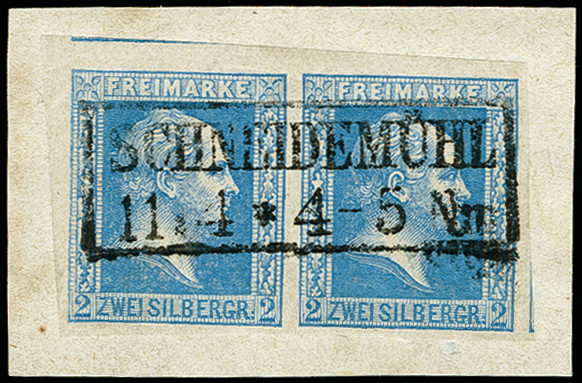 | Zusatzinformationen und Suchstichworte: | 373. Auktion Heinrich Köhler 23.-27. Juni 2020 Los 3000 2 Sgr. blau im waagerechten Paar, allseits breit- bis überrandig, links mit schmalem Bogenrand, rechts und oben mit Teilen von 2 Nachbarmarken, mit sauber zentrisch aufgesetztem Ra2 "SCHNEIDEMÜHL 11 4" auf Briefstück; unten zwischen den Marken kleiner Vortrennschnitt, die Marke nicht berührend; ein überdurchschnittliches Paar in einwandfreier Erhaltung, Fotoattest Wasels BPP (2020) Zuschlag 160,00 EUR |