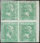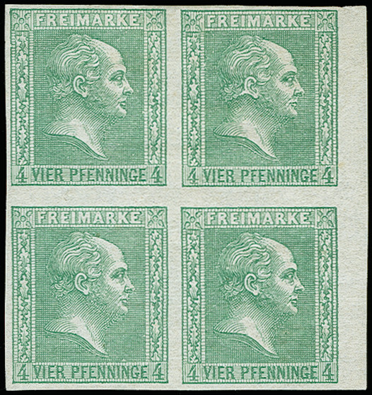 | Zusatzinformationen und Suchstichworte: | 373. Auktion Heinrich Köhler 23.-27. Juni 2020 Los 3003 1858, Gittergrund 4 Pfg. gelblichgrün im 4er-Block, voll- bis breitrandig, rechts mit schmalem Bogenrand, sehr schön farbfrisch, ungebraucht mit Originalgummi, die linke untere Marke postfrisch; die linke obere Marke kleiner Eckbug, sonst einwandfrei; eine recht selten Einheit in frischer Erhaltung, Fotoattest Wasels BPP (2020) Zuschlag 420,00 EUR |