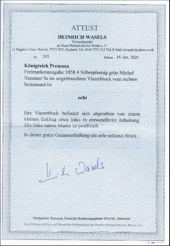 | Prüfer: | Wasels, Heinrich (BPP (Bund Philatelistischer Prüfer)) |