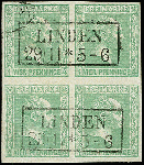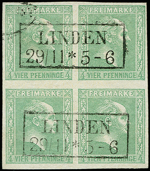 | Zusatzinformationen und Suchstichworte: | 373. Auktion Heinrich Köhler 23.-27. Juni 2020 Los 3005 4 Pfg. gelblichgrün im 4er-Block, farbfrisch und voll- bis meist breitrandig, sehr schön paarweise entwertet durch Ra2 "LINDEN 29/11", der linke obere Wert zusätzlich leichte Stempelspur, ein sehr schöner Block in tadelloser Erhaltung, Fotoattest Wasels BPP (2020) Zuschlag 950,00 EUR |