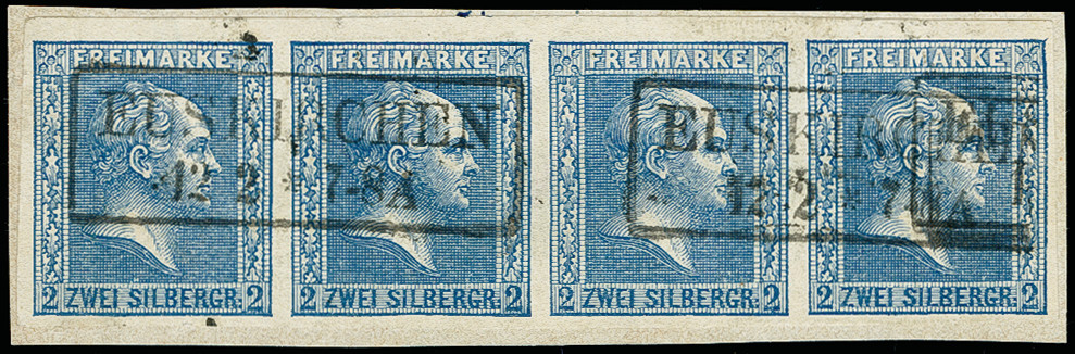 | Zusatzinformationen und Suchstichworte: | 373. Auktion Heinrich Köhler 23.-27. Juni 2020 Los 3008 2 Sgr. grauultramarin im waagerechten 4er-Streifen, farbfrisch und voll- bis meist breitrandig mit zweimal sauber aufgesetztem Ra2 "EUSKIRCHEN 12 2" auf Briefstück; die rechte Marke leichte Bugspur, sonst tadellos; eine seltene Einheit, Fotoattest Wasels BPP (2019) Zuschlag 320,00 EUR |