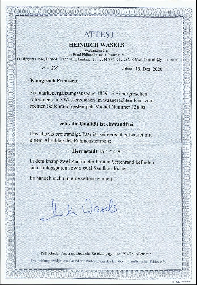| Prüfer: | Wasels, Heinrich (BPP (Bund Philatelistischer Prüfer)) |