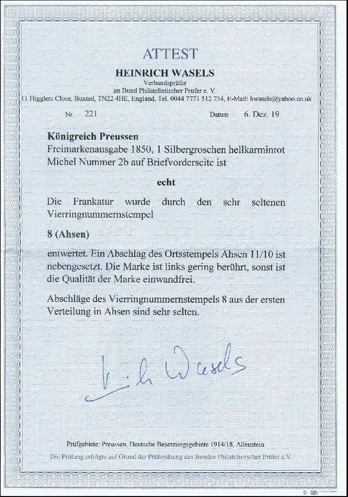 | Prüfer: | Wasels, Heinrich (BPP (Bund Philatelistischer Prüfer)) |