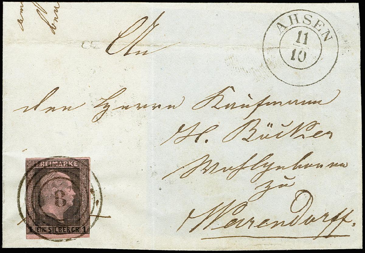 | Zusatzinformationen und Suchstichworte: | 373. Auktion Heinrich Köhler 23.-27. Juni 2020 Los 3017 "8" AHSEN (OPD MÜNSTER) gerade und glasklar auf 1850, 1 Sgr. hellkarminrot, links leicht berührt, sonst voll- bis breitrandig mit sauber nebengesetztem DKr. "AHSEN 11/6" mit einer Rückklappe nach Wahrendorf. Der Nummernstempel "8" ist eine der wenigen Nummernstempel Preußens, die dreimal vergeben wurden. Die 1. Verteilung in dem kleinen Ort Ahsen (heute Stadtteil von Datteln) ist nur auf einem einzigen anderen Beleg registriert. Eine große Seltenheit der preußischen Nummernstempel. Fotoattest Wasels BPP (2019) Ausruf 3.000,00 EUR |