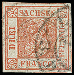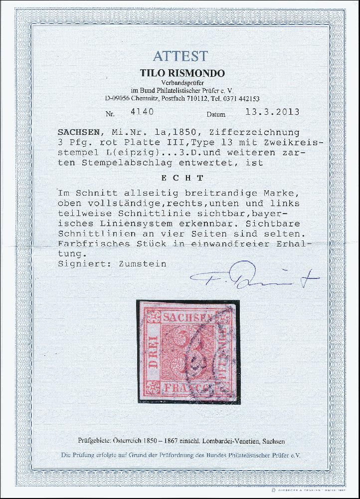 | Zusatzinformationen und Suchstichworte: | 373. Auktion Heinrich Köhler 23.-27. Juni 2020 Los 3021 3 Pfg. rot, Platte III, Type 13, farbfrisch und allseits breitrandig geschnitten, oben vollständige, rechtes, unten und links teilweise Schnittlinie sichtbar, bayerisches Liniensystem, sauber gestempelt "LEIPZIG", tadellos, ein schönes Stück, sign. Zumstein und Fotoattest Rismondo BPP (2013) (Mi. 8.500,-) Zuschlag 3.300,00 EUR |