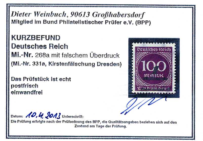 | Zusatzinformationen und Suchstichworte: | Kirstenfälschung; echte MiNr. 268a mit falschem Aufdruck |