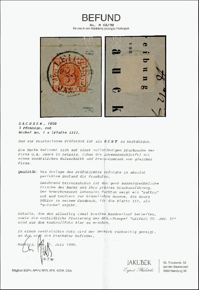 | Zusatzinformationen und Suchstichworte: | 373. Auktion Heinrich Köhler 23.-27. Juni 2020 Los 3024 1850, 3 Pfg. ziegelelrot, Platte III, Type 9, in sehr tiefer, fast bräunlichroter Nuance, allseits breitrandig geschnitten mit sichtbaren Zwischenlinien an 3 Seiten, mit sauber und gerade aufgesetztem DKr. "LEIPZIG 20 JAN. 51" auf Drucksache ohne Streifband (Produktbeschreibung einer Feuerwehrspritze der Glocken- und Kunstgießerei G.K. Jauck. Ein besonders schönes Stück in tadelloser Erhaltung, lediglich die Drucksache an den Außenrändern etwas beschnitten. Fotoattest Vaatz BPP (2019) Zuschlag 14.000,00 EUR |
