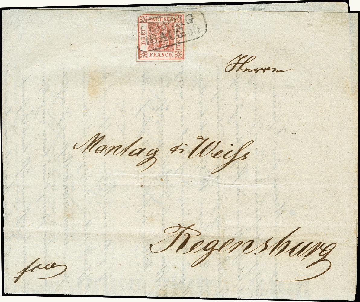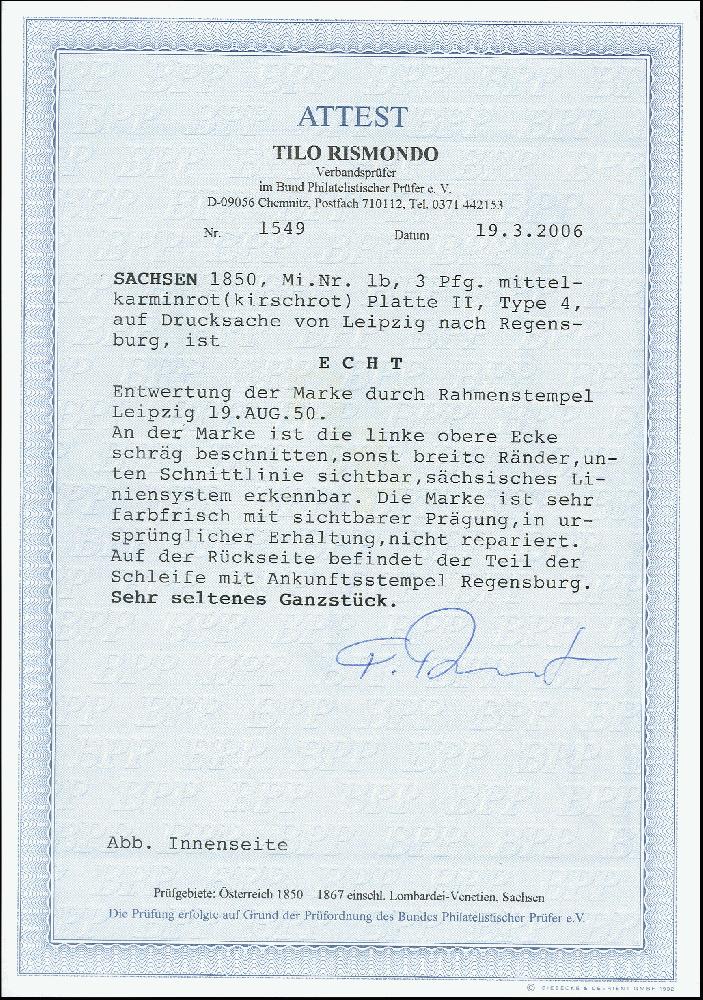 | Zusatzinformationen und Suchstichworte: | 373. Auktion Heinrich Köhler 23.-27. Juni 2020 Los 3025 3 Pfg. kirschrot in schöner frischer Farbe, links oben schräg geschnitten, sonst allseits breitrandig, unten mit Schnittlinie, daran sächsisches Liniensystem erkennbar, mit sauberem ovalen Rahmenstempel "LEIPZIG 19 AUG. 50" auf Drucksache nach Regensburg; innen mit interessanter Reklame für Dr. Bastler's Cholera-Tinktur. Bis auf den kleinen Schnittfehler tadellos; ein attraktives Ganzstück mit der seltenen Farbe, Fotoattest Rismondo BPP (2006) (Mi. 40.000,-) Zuschlag 4.800,00 EUR |