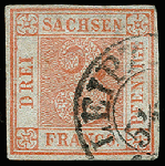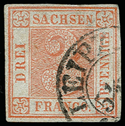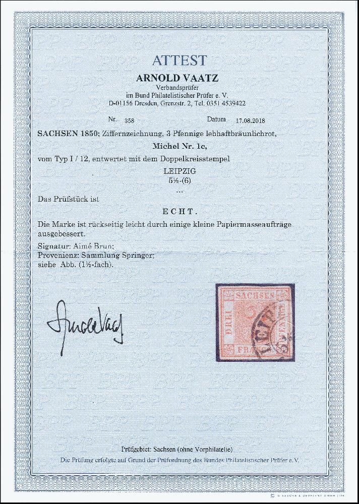 | Zusatzinformationen und Suchstichworte: | 373. Auktion Heinrich Köhler 23.-27. Juni 2020 Los 3026 3 Pfennige lebhaftbräunlichrot, Platte I, Type 12, voll- bis breitrandig, leicht entwertet durch Doppelkreisstempel von Leipzig. Rückseitig leicht durch einige kleine Papiermasseaufträge ausgebessert; optisch schönes Stück, signiert Brun und Fotoattest Vaatz BPP (2018) (Mi. 13.000,-) Zuschlag 1.600,00 EUR |