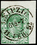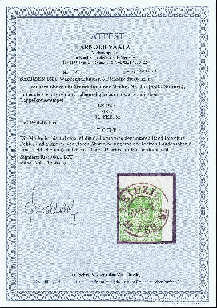 | Zusatzinformationen und Suchstichworte: | 373. Auktion Heinrich Köhler 23.-27. Juni 2020 Los 3027 1851, I. Auflage 3 Pfg. dunkelgrün in heller Nuance, unten rechts minimal berührt, sonst vollrandige rechte obere Bogenecke mit ca. 4,8/5 mm Bogenrändern, sehr schön entwertet durch DKr. "LEIPZIG 11 FEB: 52"; ein besonders schönes Stück, sign. Rismondo BPP und Fotoattest Vaatz BPP (2019) Zuschlag 400,00 EUR |