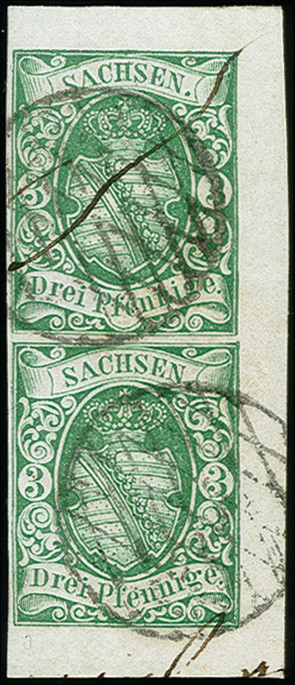 | Zusatzinformationen und Suchstichworte: | 373. Auktion Heinrich Köhler 23.-27. Juni 2020 Los 3028 1. Auflage 3 Pfg. dunkelgrün im senkrechten Paar, oben rechts und unten mit ca. 3,5-4 mm Bogenrand, links vollrandig, sehr schön farbfrisch und mit sehr schönem Prägedruck, entwertet durch Vollgitterstempel, die obere Marke zusätzlich mit Federzug, die untere Marke mit kleinem Teil einer Tintenbeschriftung, sonst einwandfrei; ein seltenes Eckrandpaar in insgesamt sehr schöner Erhaltung, Fotoattest Rismondo BPP (2014) Zuschlag 340,00 EUR |