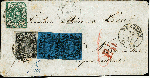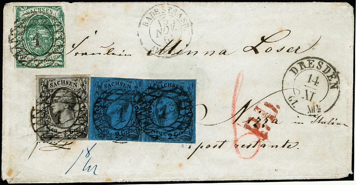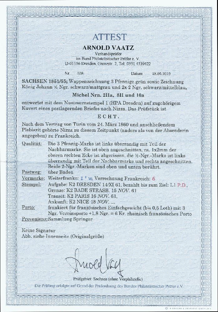 | Zusatzinformationen und Suchstichworte: | 373. Auktion Heinrich Köhler 23.-27. Juni 2020 Los 3031 FRANKREICH: 1851/63, Wappen 3 Pfennige grün mit Johann ½ Neugroschen auf mattgrau und 2 Stück 2 Neugroschen auf mittelblau, alle teils berührt, bei der 3 Pfennig die rechte obere Ecke gerissen statt geschnitten, mit Nummer "1" und nebengesetztem Doppelkreisstempel "DRESDEN 14/XI 61" auf Briefkuvert adressiert nach "Nizza in Italien, post restante", obwohl Nizza bereits 1860 dem Kaiserreich Frankreich angegliedert wurde. Der Brief ist korrekt frankiert mit 3 Neugroschen Vereinsporto und 1,8 Neugroschen (= 6 Kreuzer rheinisch) französischem Anteil. Gering unfrisch. Fotoattest Vaatz BPP (2019) Zuschlag 550,00 EUR |