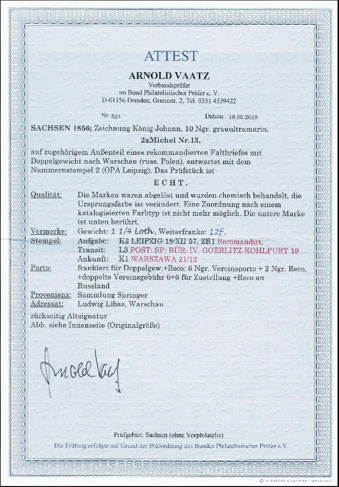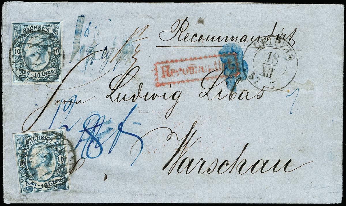 | Zusatzinformationen und Suchstichworte: | 373. Auktion Heinrich Köhler 23.-27. Juni 2020 Los 3039 POLEN: Johann 10 Neugroschen ultramarin, 2 Einzelwerte, einer unten etwas berührt, sonst beide voll- bis breitrandig mit Nummer "2" und nebengesetztem Doppelkreisstempel "LEIPZIG 18/XII 57" auf rekommandierter Briefhülle der 2. Gewichtsstufe nach Warschau mit 12 Neugroschen vermerktem Weiterfranko. Das Porto setzt sich zusammen aus 6 Neugroschen Vereinsporto, 2 Neugroschen Rekommandationsgebühr sowie dem russischen Porto von 6 Neugroschen, welches für die Rekommandation verdoppelt wurde. Die Marken waren gelöst und wurden gereinigt, sonst einwandfrei. Mehrfachfrankaturen des Höchstwertes sind sehr selten, die Köhler-Kartei-Registratur hat nur 6 weitere Doppelfrankaturen registriert, die meisten aus der bekannten Lesser-Korrespondenz. Fotoattest Vaatz BPP (2019) Zuschlag 1.080,00 EUR |