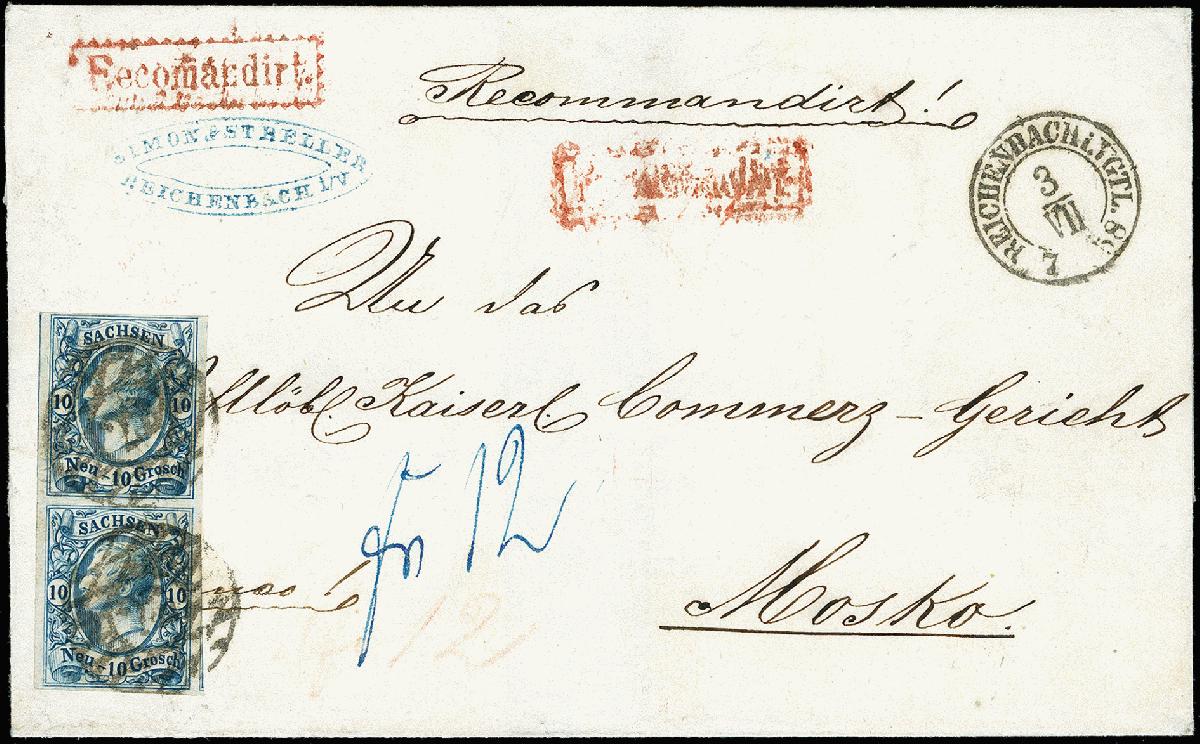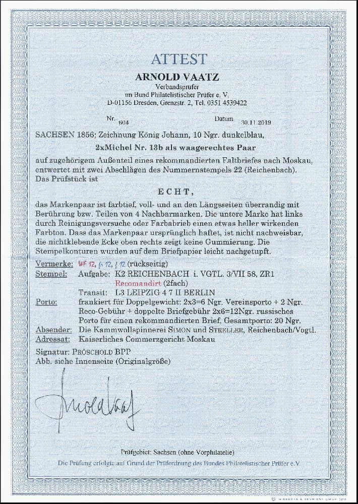 | Zusatzinformationen und Suchstichworte: | 373. Auktion Heinrich Köhler 23.-27. Juni 2020 Los 3041 10 Ngr. dunkelblau im senkrechten Paar, voll- bis meist sehr breitrandig, unten rechts mit Teil der Nachbarmarke, mit Nr. "22" und nebengesetztem DKr. "REICHENBACH i. VGTL. 3/VII 58" auf rekommandierter Briefhülle der 2. Gewichtsstufe an das kaiserliche Kommerz-Gericht in Moskau, portogerecht frankiert mit 6 Ngr. Vereinsporto, 2 Ngr. Rekommandationsgebühr sowie 12 Ngr. russischem Anteil. Der Brief ist leicht gereinigt, das Paar war gelöst, Stempelteile auf dem Briefpapier leicht nachgetupft. Eine attraktive und außerordentlich seltene Mehrfachfrankatur, wir haben nur 2 weitere Paar-Frankaturen dieser Marke registriert (beide an Lesser, Warschau). Sign. Pröschold BPP und Fotoattest Vaatz BPP (2019) Zuschlag 2.400,00 EUR |