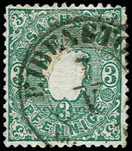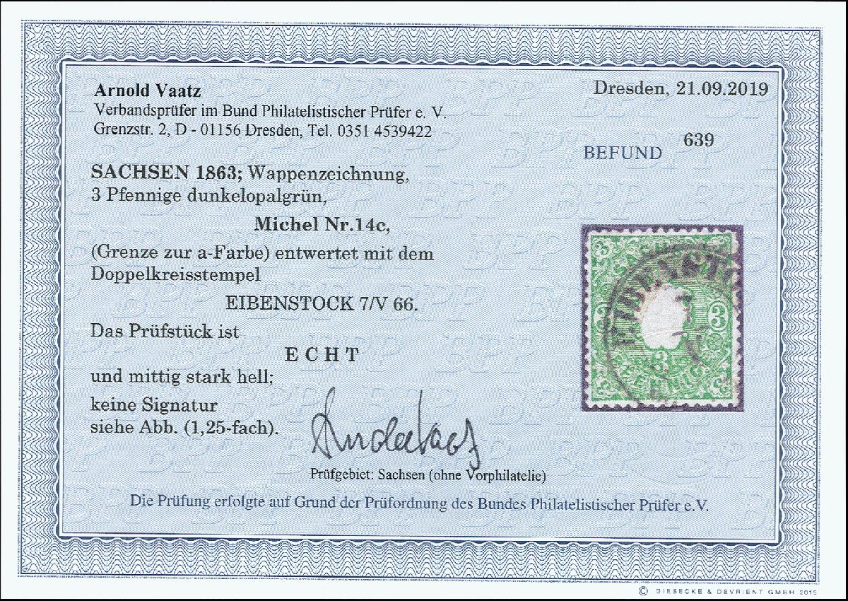 | Zusatzinformationen und Suchstichworte: | 373. Auktion Heinrich Köhler 23.-27. Juni 2020 Los 3043 1863/67, Wappen 3 Pfg. smaragdgrün, farbfrisch und gut gezähnt mit sauberem Stempel "EIBENSTOCK 7/V 66", rückseitig kleine helle Stelle, gutes Vergleichsstück der sehr seltenen Farbvariante, Fotobefund Vaatz BPP Zuschlag 120,00 EUR |