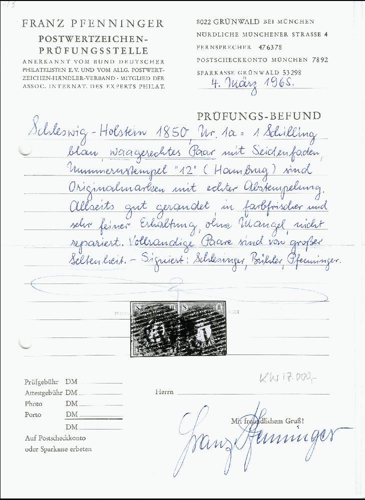 | Zusatzinformationen und Suchstichworte: | 373. Auktion Heinrich Köhler 23.-27. Juni 2020 Los 3049 1 Sch. dunkelblau im waagerechten Paar, sehr schöne tiefe, fast schwarzblaue Farbe, voll-bis meist breitrandig , sauber entwertet durch Roststempel "12" von Hamburg; eine sehr seltene und attraktive Einheit in tadelloser Erhaltung, Fotoatteste Pfenninger (1965) und Moeller BPP (2020) Zuschlag 6.500,00 EUR |