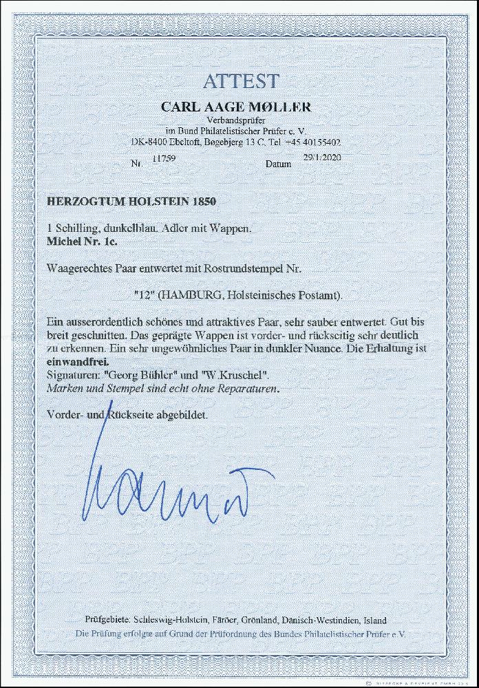 | Zusatzinformationen und Suchstichworte: | 373. Auktion Heinrich Köhler 23.-27. Juni 2020 Los 3049 1 Sch. dunkelblau im waagerechten Paar, sehr schöne tiefe, fast schwarzblaue Farbe, voll-bis meist breitrandig , sauber entwertet durch Roststempel "12" von Hamburg; eine sehr seltene und attraktive Einheit in tadelloser Erhaltung, Fotoatteste Pfenninger (1965) und Moeller BPP (2020) Zuschlag 6.500,00 EUR |