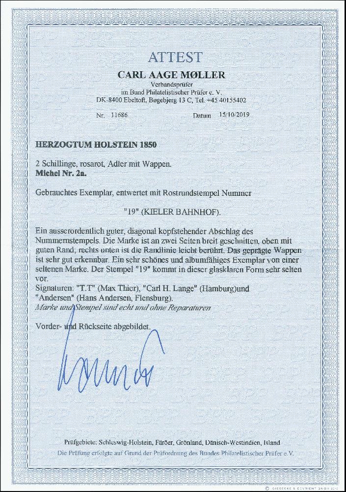 | Zusatzinformationen und Suchstichworte: | 373. Auktion Heinrich Köhler 23.-27. Juni 2020 Los 3051 2 Sch. rosa, rechts unten leicht berührt, sonst voll- bis sehr breitrandig mit glasklar aufgesetztem Roststempel "19" KIELER BAHNHOF, ein schönes Stück in sonst einwandfreier Erhaltung, mehrfach sign. und Fotoattest Moeller BPP (2019) Zuschlag 1.100,00 EUR |