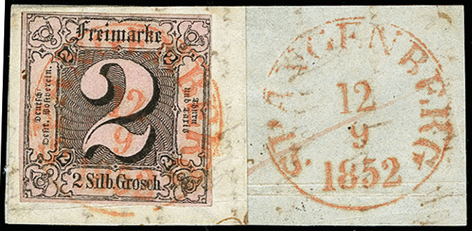 | Zusatzinformationen und Suchstichworte: | 373. Auktion Heinrich Köhler 23.-27. Juni 2020 Los 3061 2 Sgr. auf graurot, voll- bis breitrandig mit zentrisch aufgesetztem roten EKr. "SPANGENBERG 12/9 1852" auf kleinem Briefstück (dieses auf weiters Briefstück mit gleichem Nebenstempel montiert); Marke links unten kleiner Vortrennschnitt, sonst einwandfrei, Fotobefund Sem BPP Zuschlag 120,00 EUR |