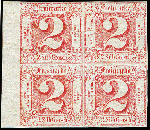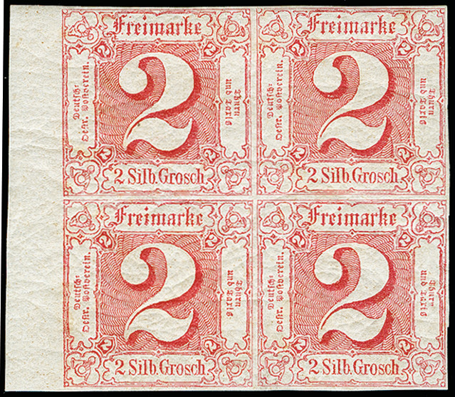 | Zusatzinformationen und Suchstichworte: | 373. Auktion Heinrich Köhler 23.-27. Juni 2020 Los 3064 1859/61, Ziffern auf weißem Papier 2 Sgr. karminrot im 4er-Block vom linken Bogenrand, allseits voll- bis breitrandig, links mit ca. 6 mm Bogenrand, sehr schön farbfrisch, ungebraucht mit Originalgummi, die beiden unteren Werte postfrisch mit ganz leichter und belangloser Gummi-Patina. Ungebrauchte Einheiten dieser Marke sind außerordentlich selten, wir haben nur 2 weitere 4er-Blocks registriert (ex Tomasini bzw. Boker). Fotoattest Sem BPP (2019) Zuschlag 700,00 EUR |