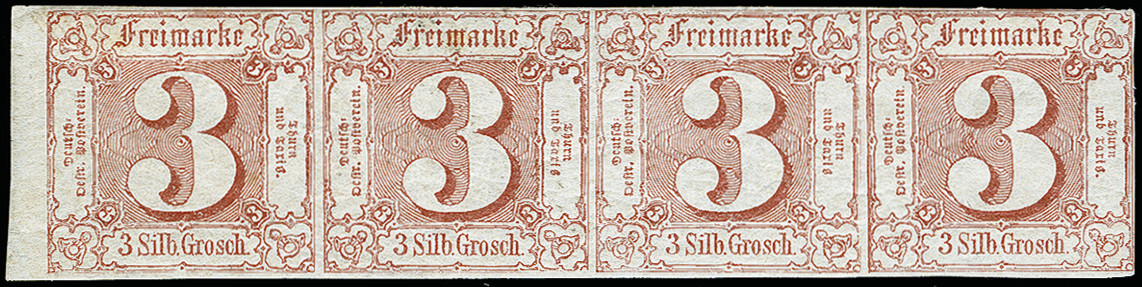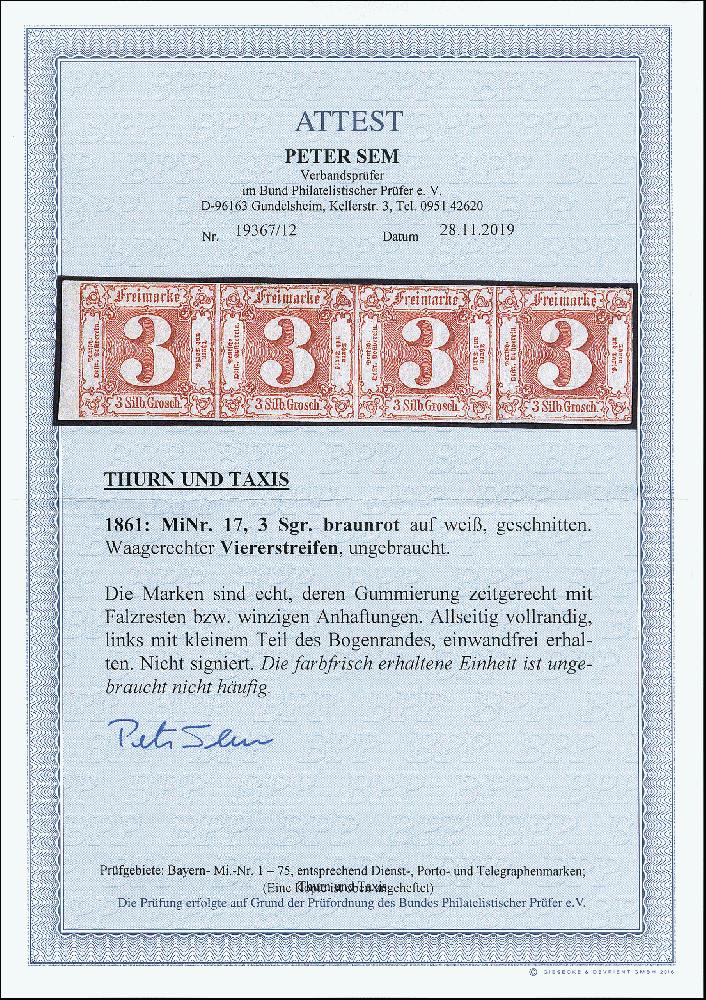 | Zusatzinformationen und Suchstichworte: | 373. Auktion Heinrich Köhler 23.-27. Juni 2020 Los 3065 3 Sgr. braunrot im waagerechten 4er-Streifen, allseits voll- bis breitrandig, links mit ca. 3 mm Bogenrand, ungebraucht mit Originalgummi. Eine attraktive und seltene Einheit, Fotoattes Sem BPP (2019) Zuschlag 260,00 EUR |