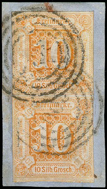 | Zusatzinformationen und Suchstichworte: | 373. Auktion Heinrich Köhler 23.-27. Juni 2020 Los 3066 10 Sgr. orange im senkrechten Paar, gut geschnitten, allseits vollrandig, teils Randlinienschnitt, mit Nr. "300" HAMBURG auf Briefstück; das Paar war zur Kontrolle gelöst und ist neu befestigt, einwandfrei, Fotoatteste RPS (1948) und Sem BPP (2011) Zuschlag 300,00 EUR |