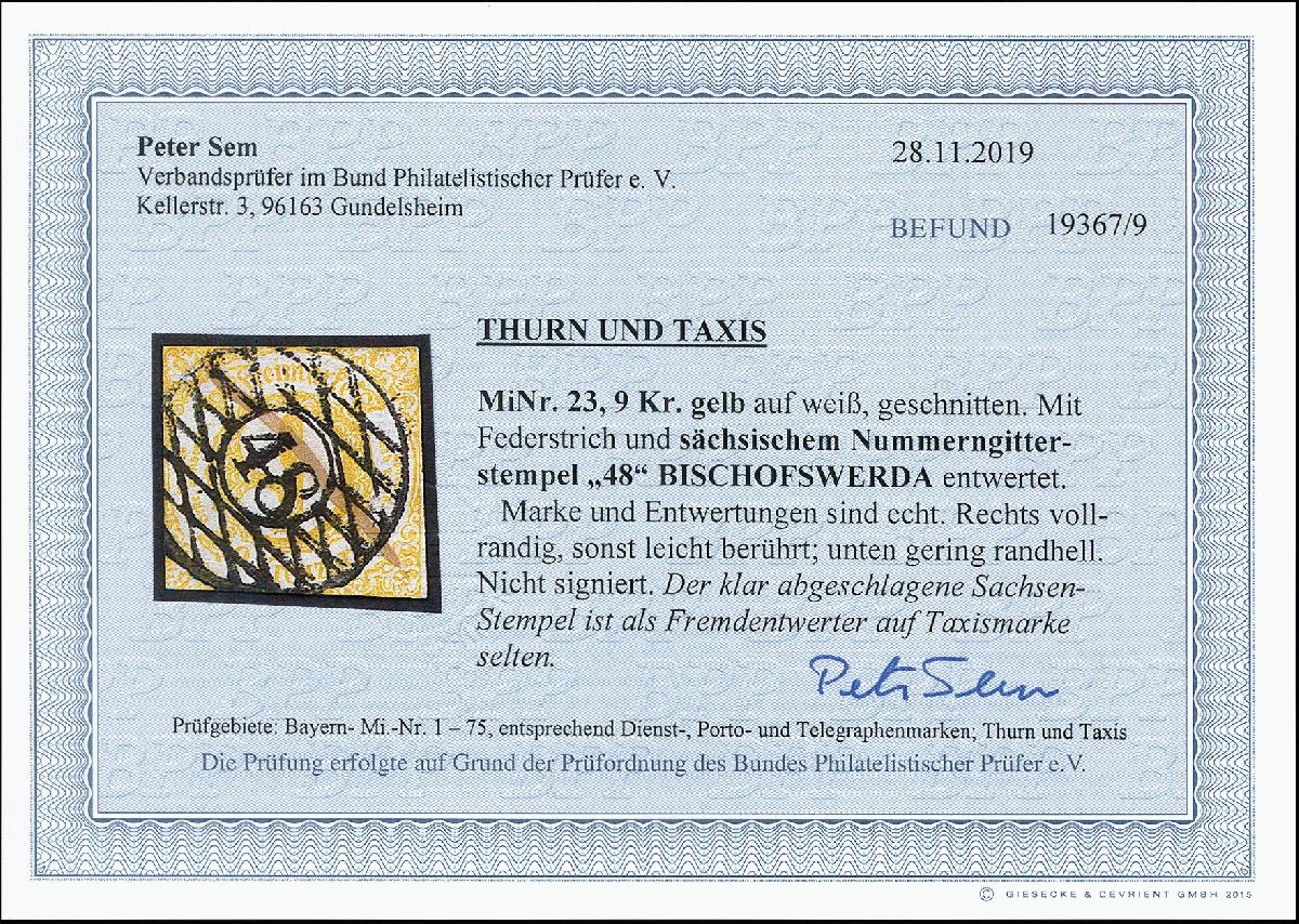 | Zusatzinformationen und Suchstichworte: | 373. Auktion Heinrich Köhler 23.-27. Juni 2020 Los 3067 9 Kr. gelb in üblichem Taxis-Schnitt, entwertet durch Federstrich und zentrisch klar aufgesetztem sächsischem Nummernstempel "48" BISCHOFSWERDA, Pracht, Fotobefund Sem BPP (2019) Zuschlag 90,00 EUR |