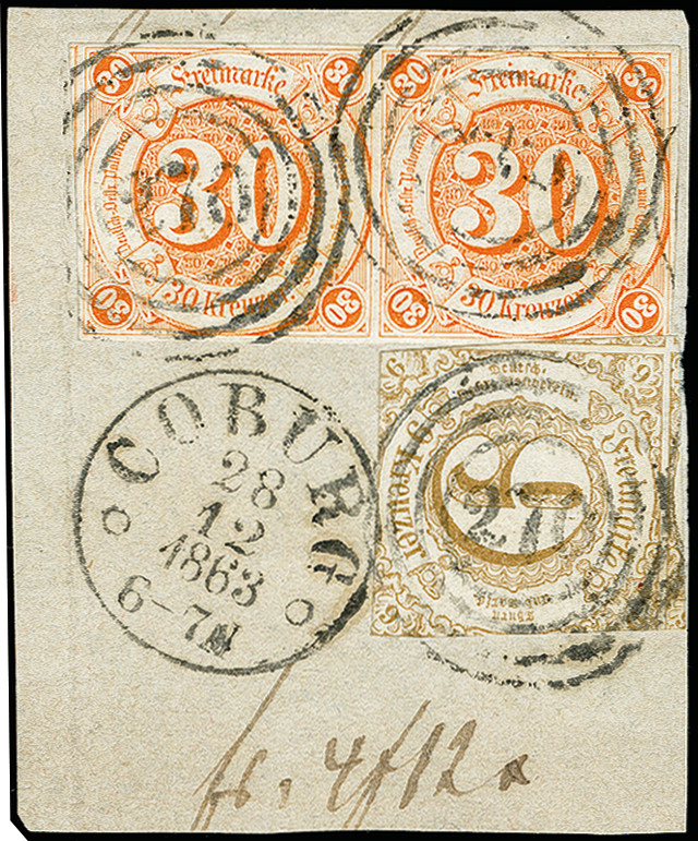 | Zusatzinformationen und Suchstichworte: | 373. Auktion Heinrich Köhler 23.-27. Juni 2020 Los 3069 30 Kr. orange im waagerechten Paar, farbfrisch und voll- bis breitrandig, zusammen mit etwas berührter 9 Kr. braun mit Nr. "270" und nebengesetztem EKr. "COBURG 28 12 1863" auf Briefstück, Kabinett, Fotoattest Sem BPP (2019) Zuschlag 650,00 EUR |
