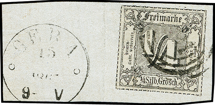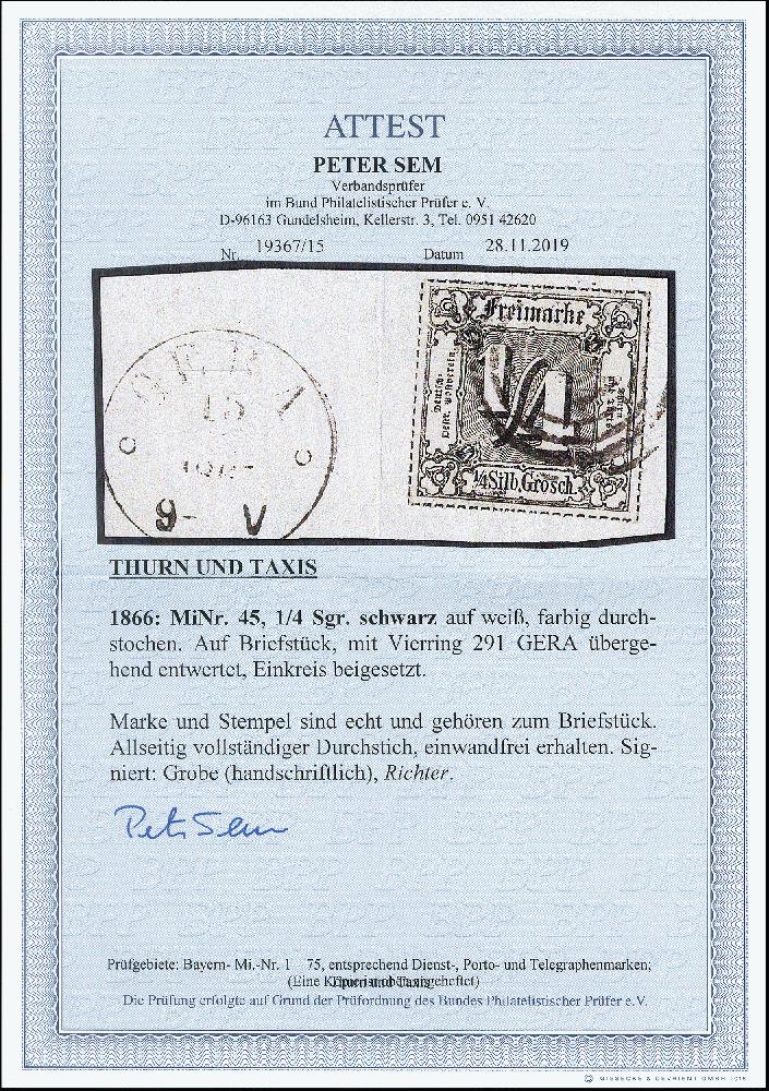 | Zusatzinformationen und Suchstichworte: | 373. Auktion Heinrich Köhler 23.-27. Juni 2020 Los 3073 1866, Farbig durchstochen: ¼ Sgr. schwarz, farbfrisch und tadellos durchstochen mit leicht aufgesetzter Nr. "291" auf Briefstück mit nebengesetztem EKr. "GERA 15 ..", Kabinett, sign. Grobe und Richter sowie Fotoattest Sem BPP (2019) Zuschlag 500,00 EUR |