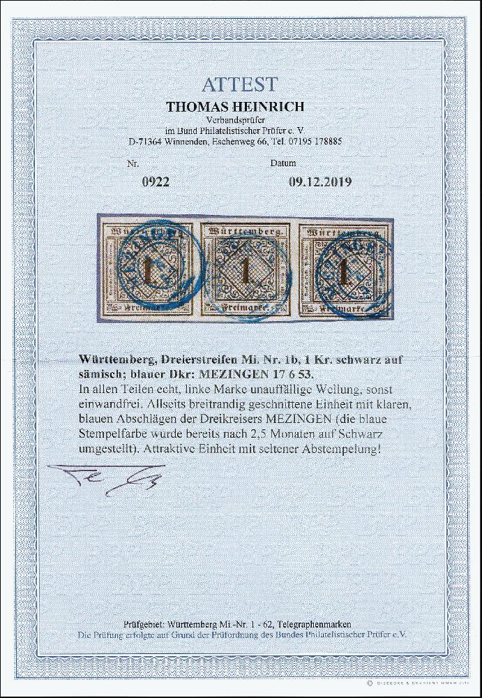 | Zusatzinformationen und Suchstichworte: | 373. Auktion Heinrich Köhler 23.-27. Juni 2020 Los 3077 1851, Ziffernausgabe 1 Kr. auf sämisch im waagerechten 3er-Streifen, farbfrisch und allseits voll- bis meist breitrandig geschnitten, sehr schön entwertet durch blauen DKr. "MEZINGEN 17/6 53"; die linke Marke unauffällige Wellung, sonst tadellos. Eine attraktive und seltene Einheit, Fotoattest Heinrich BPP (2019) Zuschlag 480,00 EUR |