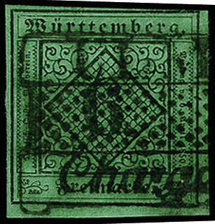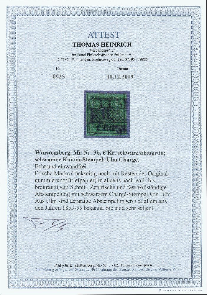 | Zusatzinformationen und Suchstichworte: | 373. Auktion Heinrich Köhler 23.-27. Juni 2020 Los 3080 6 Kr. auf blaugrün, voll- bis breitrandig und farbfrisch, sauber entwertet durch großen Teilabschlag des Zier-Rahmenstempels "ULM / Chargé", rückseitig noch Reste des Originalgummis und Briefpapiers, Pracht, Fotoattest Heinrich BPP (2019) Zuschlag 440,00 EUR |
