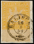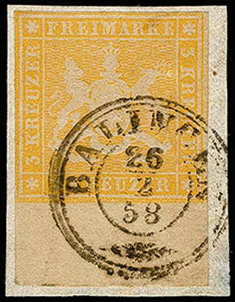 | Zusatzinformationen und Suchstichworte: | 373. Auktion Heinrich Köhler 23.-27. Juni 2020 Los 3085 3 Kr. orangegelb, allseits voll- bis breitrandig, rechts mit Teil der Nachbarmarke und unten mit 10 mm Bogenrand, mit sauber aufgesetztem DKr. "BALINGEN 26/2 58" auf kleinem Briefstück. Das Papier der Marke durch schwefelhaltige Gummierung etwas getönt. Ein Ausnahmestück in einwandfreier Erhaltung. Fotobefund Heinrich BPP Zuschlag 170,00 EUR |