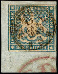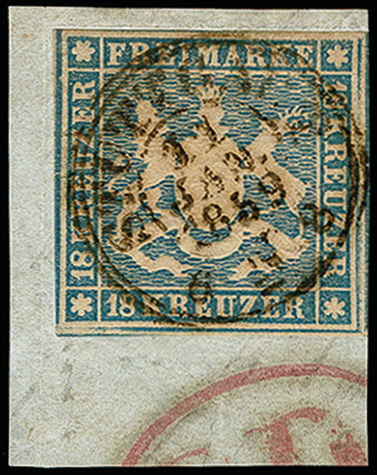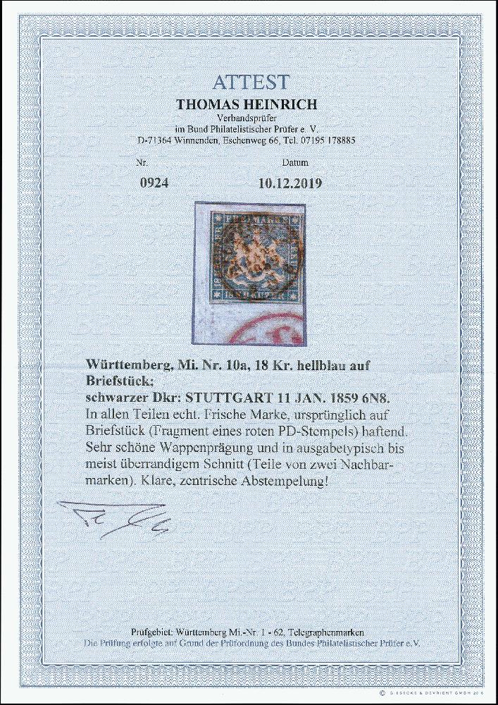 | Zusatzinformationen und Suchstichworte: | 373. Auktion Heinrich Köhler 23.-27. Juni 2020 Los 3087 1857, 18 Kr. hellblau, farbfrisch und für diese Ausgabe sehr gut geschnitten, rechts und unten mit Teilen der Nachbarmarken, mit zentrischem DKr. "STUTTGART 11 JAN. 1859" auf kleinem Briefstück, Kabinett, Fotoattest Heinrich BPP (2019) Zuschlag 600,00 EUR |
