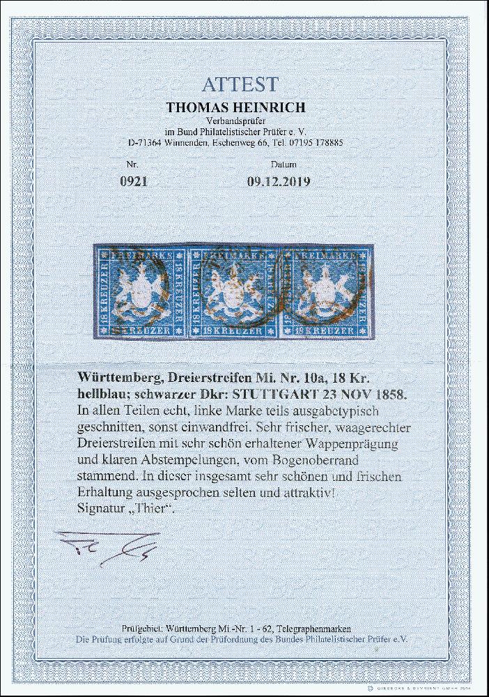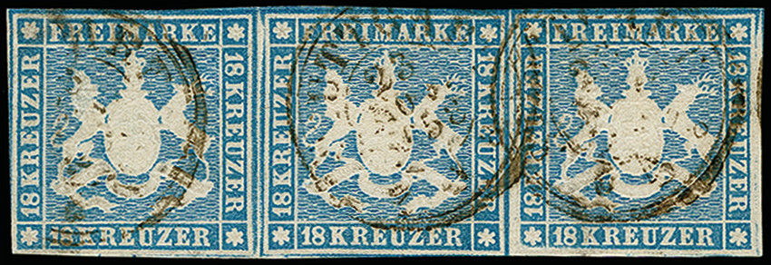 | Zusatzinformationen und Suchstichworte: | 373. Auktion Heinrich Köhler 23.-27. Juni 2020 Los 3088 18 Kr. hellblau im waagerechten 3er-Streifen, sehr schön farbfrisch und für diese Ausgabe gut bis sehr gut geschnitten, vom oberen Bogenrand stammend, entwertet durch DKr. "STUTTGART 23 NOV 1858". Ein seltener Streifen in einwandfreier Erhaltung. Sign. Thier und Fotoattest Heinrich BPP (2019) Zuschlag 2.100,00 EUR |
