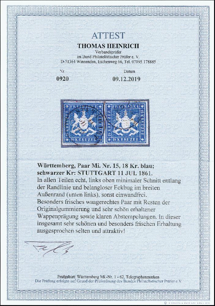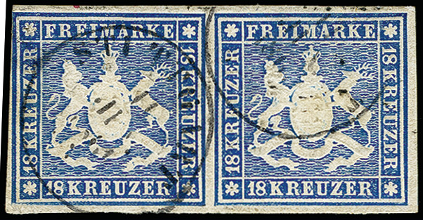 | Zusatzinformationen und Suchstichworte: | 373. Auktion Heinrich Köhler 23.-27. Juni 2020 Los 3091 1859, Wappenausgabe ohne Seidenfaden 18 Kr. blau im waagerechten Paar, links oben minimaler Randlinienschnitt, sonst allseits breitrandig und farbfrisch mit leicht aufgesetztem Kr. "STUTTGART 11 JUL 1861"; links unten belangloser kleiner Eckbug im breiten Außenrand, sonst tadellos. Ein attraktives Paar in überdurchschnittlicher Erhaltung. Fotoattest Heinrich BPP (2019) Zuschlag 850,00 EUR |