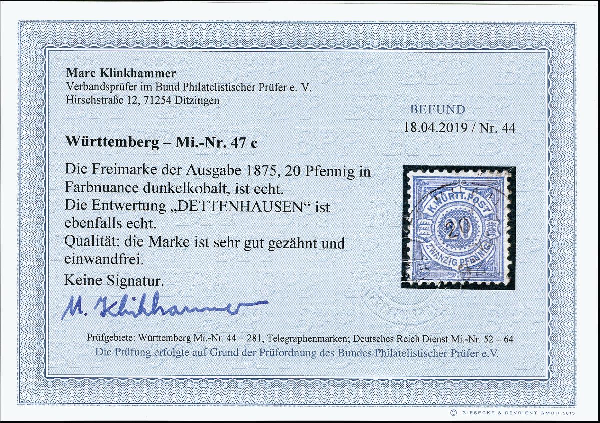 | Zusatzinformationen und Suchstichworte: | 373. Auktion Heinrich Köhler 23.-27. Juni 2020 Los 3105 1875, Ziffernausgabe 20 Pfg. dunkelkobalt, sauber gestempelt, Pracht, Fotobefund Klinkhammer BPP (2019) (Mi. 300,-) Zuschlag 90,00 EUR |