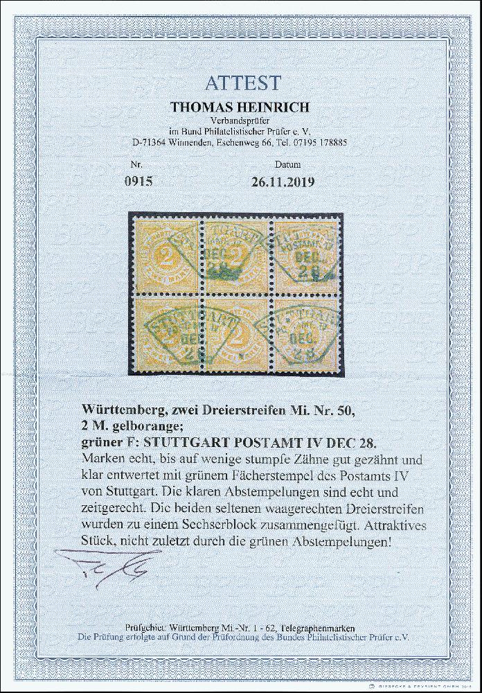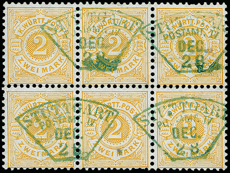 | Zusatzinformationen und Suchstichworte: | 373. Auktion Heinrich Köhler 23.-27. Juni 2020 Los 3106 1875, 2 M. gelborange, 2 waagerechte 3er-Streifen zum 6er-Block zusammengefügt, sehr schön entwertet durch viermal sauber aufgesetztem grünen Fächerstempel "STUTTGART POSTAMT IV DEC 28", Kabinett, ein besonders attraktives Ensemble. Fotoattest Heinrich BPP (2019) Ausruf 700,00 EUR |