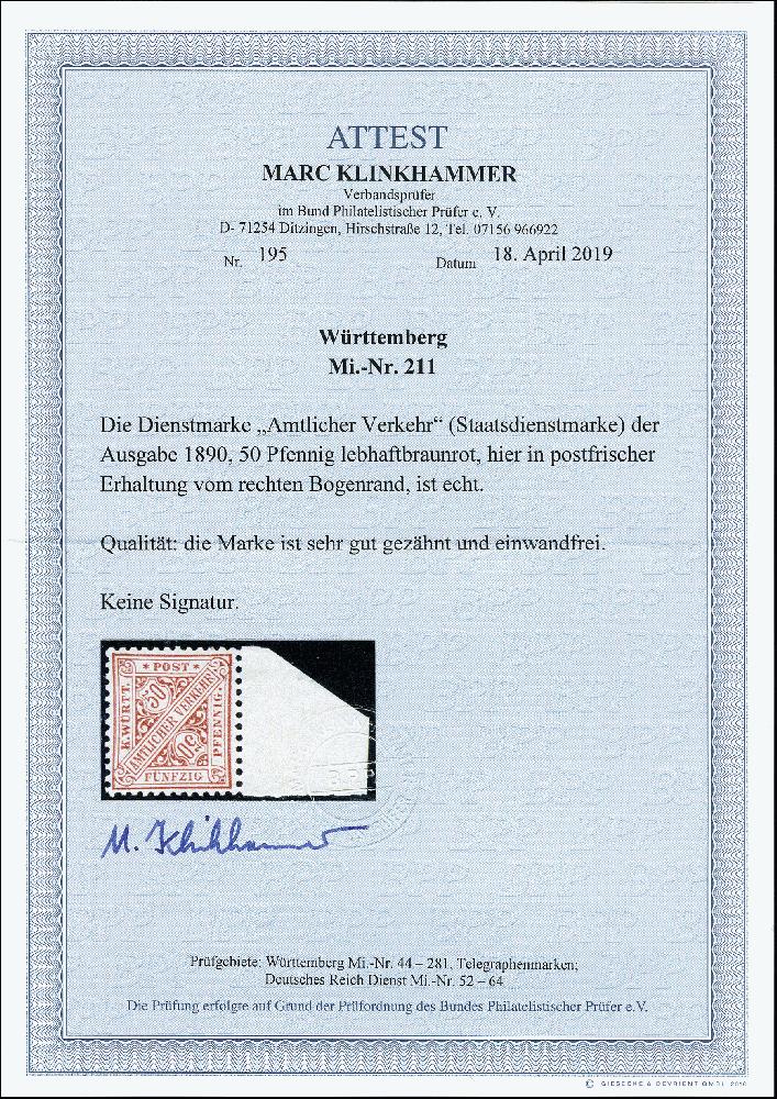 | Prüfer: | Klinkhammer, Marc (BPP (Bund Philatelistischer Prüfer)) |