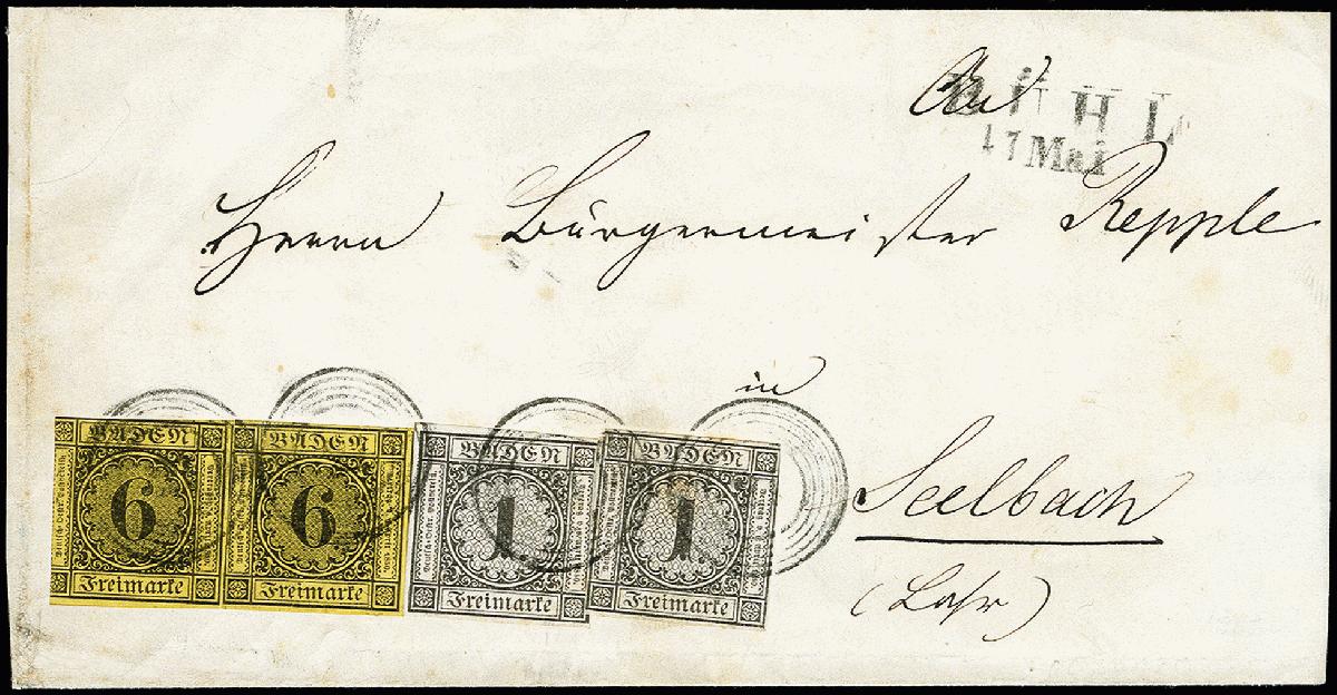 | Zusatzinformationen und Suchstichworte: | 371. Auktion Heinrich Köhler 24.-28. September 2019 Los 2518 1853/54, 1 Kr. schwarz und 6 Kr. auf gelb, je 2 Einzelwerte, als Streifen geklebt mit Nummer "21" und nebengesetztem L2 "BÜHL 17 Mai" auf Briefhülle (eine Seitenklappe fehlend) der 4. Gewichtsstufe mit vorausbezahltem Landpost- und Bestellgeld nach Seelbach bei Lahr. Eine seltene 14 Kreuzer-Inlandsfrankatur; Fotoattest Stegmüller BPP (2019) Zuschlag 850,00 EUR |